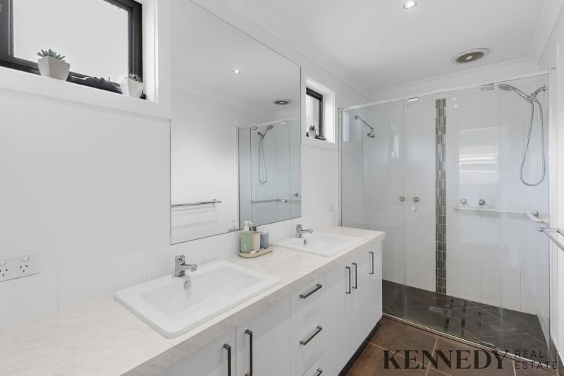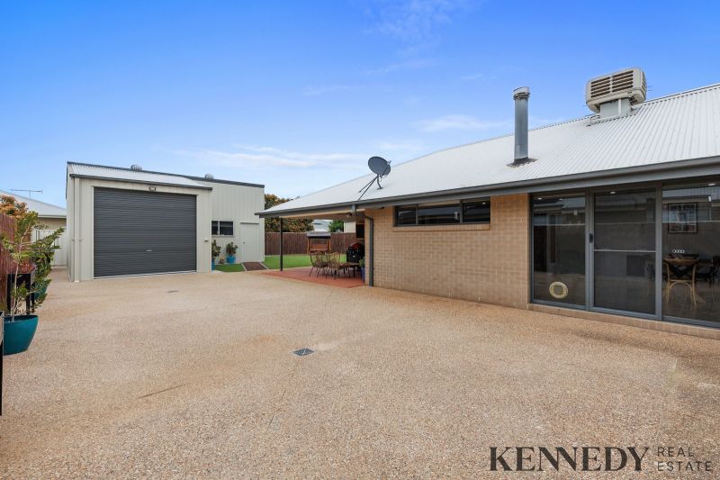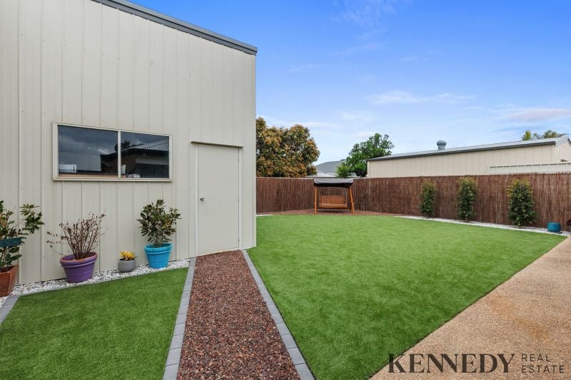 The kitchen has been thoughtfully renovated, featuring a modern blend of white, timber, and black cabinetry, along with a hidden butler’s pantry for added functionality. There are four generously sized bedrooms, three with built-in robes, while the master suite boasts a walk-in robe, a private ensuite, and direct access to the alfresco area. A central family bathroom serves the remaining bedrooms. Comfort is assured year-round with evaporative cooling, ducted gas heating, a cozy Coonara wood heater, ceiling fans, and two split systems. A solar system is also in place, enhancing energy efficiency. Outside, a double lock-up garage provides internal access directly to the kitchen for everyday convenience. The covered alfresco area is perfect for relaxing or entertaining, and fully aggregated concrete paths surround the home. There’s also drive-through access to the backyard and a large shed for all your storage needs.