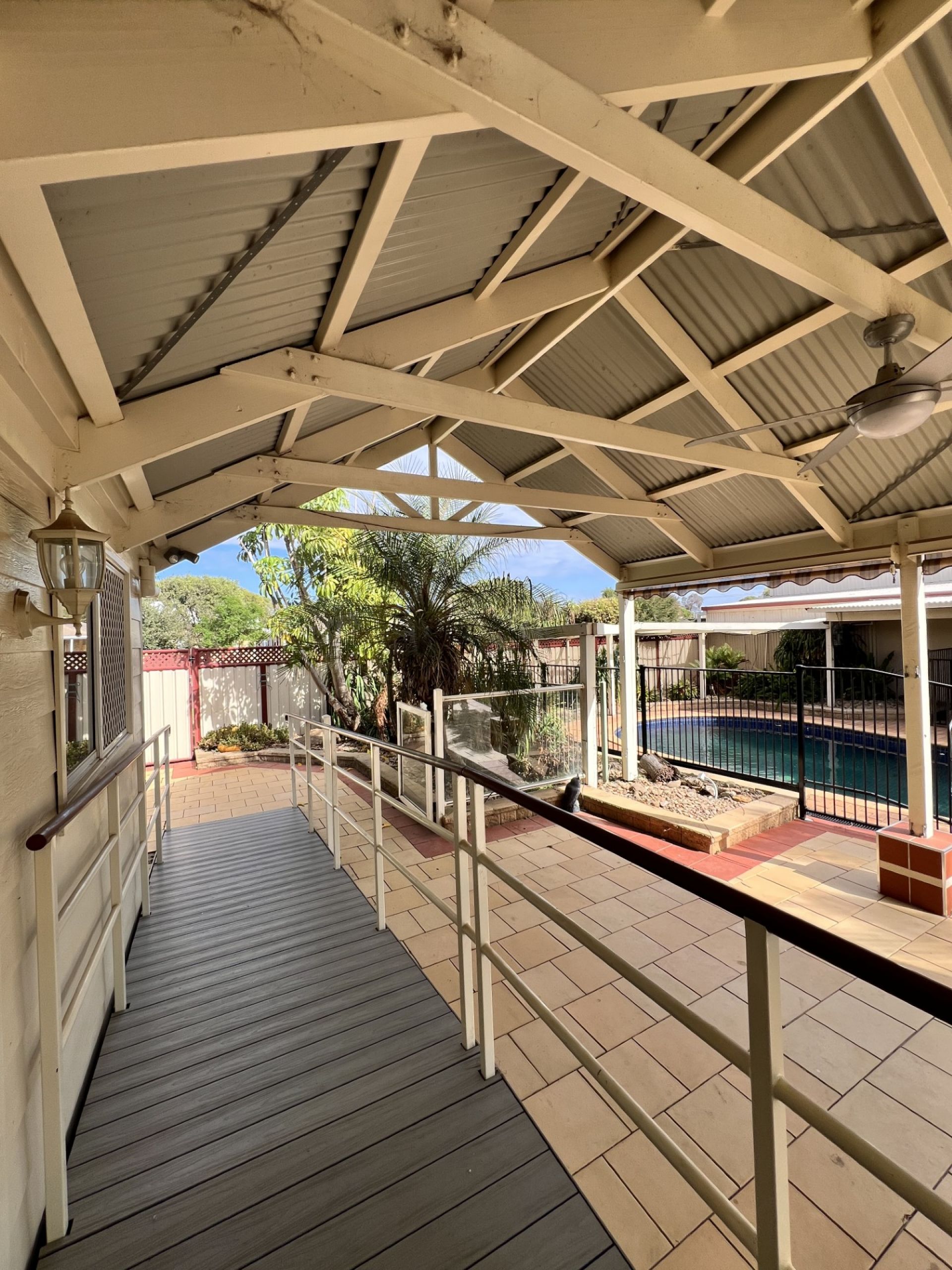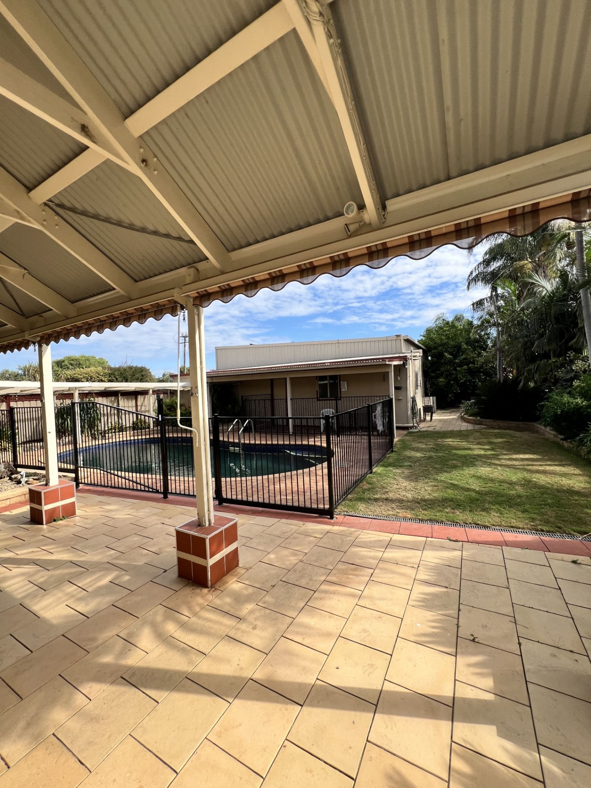 Located on a prime corner block across from Purtle Park, it offers stunning lake views. The home features a tropical-style pool surrounded by lush greenery, spacious bedrooms, high ceilings, and a relaxing front porch. Additional amenities include a single-car garage with workshop or bungalow, a poolside bathroom.